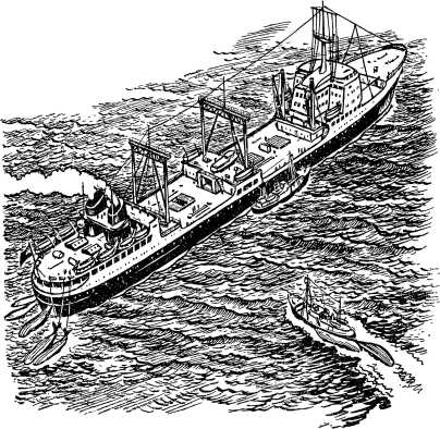Оставалось запастись терпением и ждать помощи. Терпения хватало, но китобоев беспокоило другое: вокруг судна плавало множество айсбергов — огромных ледяных гор. Длина некоторых из них достигала 100 метров. Они глубоко сидели в воде. Стоило киту нырнуть под ближайший айсберг — и все было бы кончено; судну не миновать смертельного удара о льдину. Но вот показалась подмога. К пленнику на всех парах мчался другой китобоец. С него выстрелили по киту из гарпунной пушки. Гарпун опять только ранил кита. Разъяренный и еще полный сил, кит на двух тросах, как на вожжах, потащил за собой уже два судна: одно — за корму, другое — за нос.