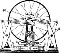 Схема двигателя Костовича. 1 — камера сгорания; 2 — поршни; 3 — цилиндры, 4 — подвод горючей смеси; 5 — выхлопная труба; 6 — распределительный вал; 7 — коленчатый вал; 8 — коромысла; 9 — шатуны; 10 — маховик.