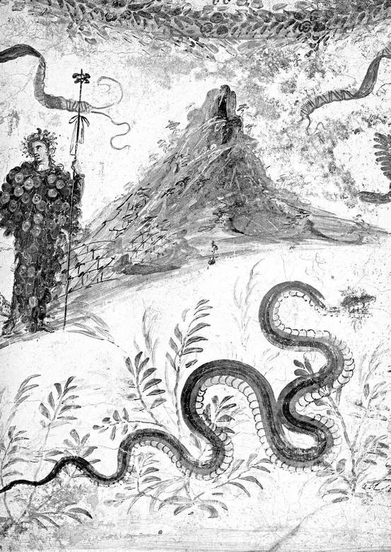 Везувий, изображенный на фреске Вакха в Помпеях. Эта гора уже никогда не будет такой. Верхушку вулкана снесет во время извержения