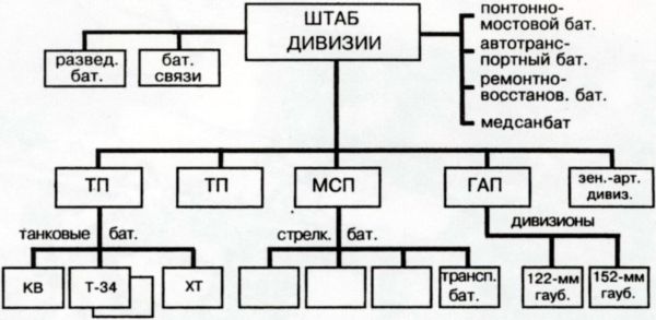 Cхема организации советской танковой дивизии мехкорпуса 1940 г. (11 343 человека. 413 танков, из них: 105 — КВ, 200 — Т-34, 26 — БТ-7, 18 — Т-26, 54 — химических. Бронеавтомобилей — 91. Орудий и минометов — 58).