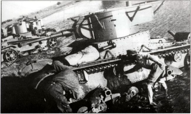 Советские танкисты моют Т-26 после учений. На заднем плане видны устаревшие модификации двухбашенных Т-26 — к 1941 г. уже явно переведенные в разряд учебных.