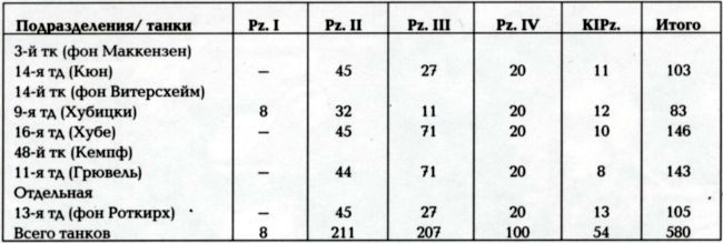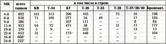 Из 16 танковых дивизий танками КВ и Т-34 укомплектованы четыре: 8-я и 32-я тд 4-го МК (на 88 и 71 %), 21-я тд 8-го МК (на 60 %) и 10-я тд 15-го МК (на 57 %).