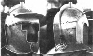 Композитные шлемы можно разделить на два основных типа. Шлемы первого типа состояли из двух полусфер, крепившихся к узкой полоске гребня, которая тянулась от лицевой к затылочной части каски. Шлемы второго типа изготовлялись из нескольких пластин, соединявшихся между собой. Как правило, такая конструкция характерна для касок конической формы. К шлему могли добавляться тыльник и нащечники, которые изготовлялись отдельно и обычно крепились кожаными или льняными ремнями либо с помощью шарниров. В нащечниках, посередине их верхнего ребра, располагались ушные отверстия. Отдельные шлемы были снабжены дополнительной защитой в виде Т-образной назальной пластины. Такая пластина, однако, была весьма непрочной и служила, скорее, для того, чтобы отклонить удар, чем для того, чтобы смягчить его[332]. Сборка отдельных деталей шлема осуществлялась на последнем этапе перед креплением кожаной подбивки[333]. Шлемы могли и не иметь подбивки. В этом случае воин носил на голове шерстяной подшлемник (cento) (Amm., XIX, 8, 8).