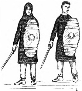 Панцири и кольчуги. В III–IV вв. меняются типы кольчуг и панцирей, использовавшихся римлянами. Lorica segmentata совершенно выходит из употребления во второй половине III в.[336] Основным видом доспеха становится кольчуга, или lorica hamata. Кольчуги времен Поздней империи отличались большим разнообразием. Были кольчуги короткие, длинные, без рукавов, с рукавами до локтя, с рукавами до запястья. В манускрипте Vergil ins Vaticanus (Cod. Lat., 3225) изображены воины в кольчугах с капюшонами[337].