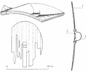 Конструкция римского щита из Дура-Европос (Bishop М. С, CoulstonJ. С. N. Roman Military Equipment from the Punic Wars to the fall of Rome. London: Batsford, 1993. P. 151): 1 — щит; 2 — рукоятка; 3 — умбон.
