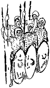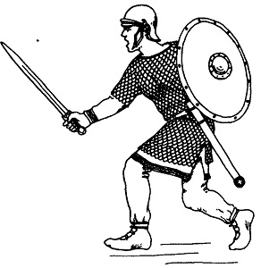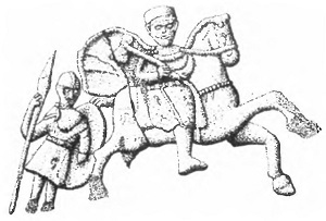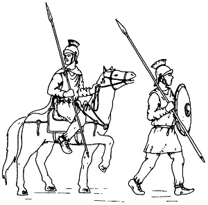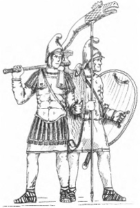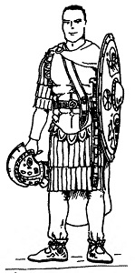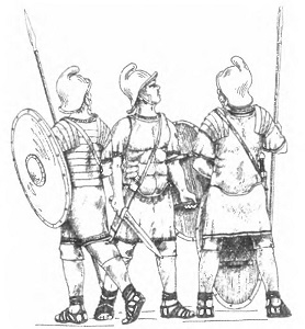 Прорисовка изображения на фреске из синагоги из Дура-Европос (на ногах солдат видны поножи) (Stephenson I. Р. Roman Infantry Equipment. The Later Empire. Gloucestershire: Tempus Publishing Ltd, 2001. P. 46)