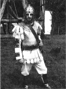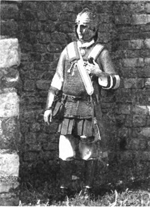 Реконструкция, представляющая тяжеловооруженного римского воина первой половины IV в.: на его голове шлем типа Berkasovo II (начало — середина IV в.). Корпус защищает короткая кольчуга, рукава и низ которой окаймлены полосами из бронзовых колец. Подобный элемент украшения можно увидеть на миниатюре в Notitia Dignitatum. Из-под кольчуги видны птеруги торакомаха. Меч-спата висит на портупее.