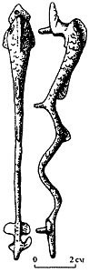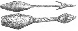 Стрелы, как и в более раннюю эпоху, имели трехгранный наконечник[360]. Такой тип наконечника был характерен для римских стрел уже в III в.[361]. Тем не менее в IV в. получают распространение также узкие и плоские наконечники германского образца. Другим широко использовавшимся типом наконечника был наконечник с двумя зазубринами, также заимствованный у германцев. На древках стрел были указаны имя владельца и подразделение, в котором он служил[362].