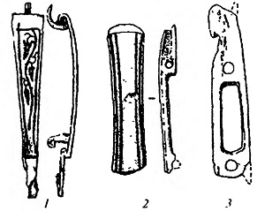 Скобы для крепления портупеи к ножнам меча: 1 — железная; 2 и 3 — из оленьего рога (Stephenson I. Р. Roman Infantry Equipment. Р. 67; Lebedinsky I. Aimes et guerriers barbares au temps des grandes invasions (IV au VI siecle apr. J.-C.) Paris: France, 2001. P. 125)
