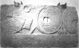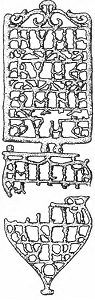Ажурная накладка, украшавшая портупею: надпись на прямоугольной части накладки: «NUMERUM OMNIUM». Надпись на концевой части декоративной накладки: «MILITANTIUM». Общий смысл надписи на фанере и ажурной накладке: «Храни [Юпитер] наилучшим и наидостойнейшим образом всех тех, кто несет военную службу» (Stephenson I. Р. Roman Infantry Equipment. Р. 70, 71)