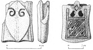 Четырехугольный полуцилиндрический scutum, который был основным видом щита римского легионера во II в., применялся и в первой половине III в., о чем свидетельствуют фрагменты трех щитов и один почти целый экземпляр, обнаруженные в Дура-Европос[315]. Вместе с тем уже рельефы на колонне Марка Аврелия и на триумфальной арке Септимия Севера изображают легионеров с небольшими овальными или гексагональными щитами[316].