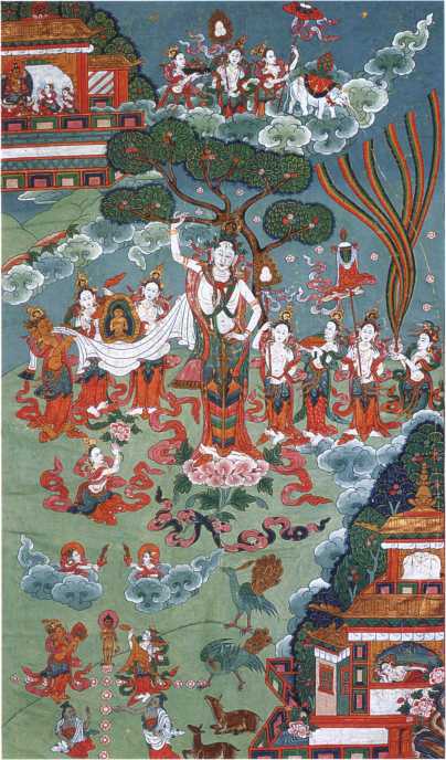 Изображения под названием «Двенадцать деяний Будды Шакьямуни» посвящены его последней земной жизни. На одной из икон этой серии изображена его мать, прекрасная Майя, жена царя шакьев Шуддходаны. Однажды царица увидела чудесный сон. Ей приснилось, что в её правый бок вошёл спустившийся с неба белый слон. Позже мудрецы объяснили удивлённой женщине, что она будет матерью великого Учителя, который постигнет истину и станет Буддой. Через десять месяцев в священной роще Лумбини Майя произвела на свет младенца.