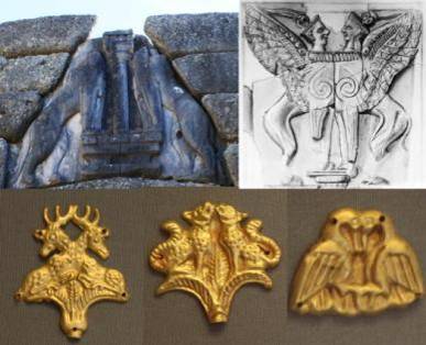 Дальнейшее развитие парных симметричных изображений мы можем видеть в изображениях Великой Матери или Артемиды Орфии, у которой пара львов или других животных служит атрибутом (к этому типу изображений относится и гидрия из Берна). Архаические изображения богов – это столпообразные фигуры. поэтому колонна на Львиных воротах вполне могла означать тело богини, а ее голова и верхняя часть туловища располагались выше и были изготовлены отдельно. Узкое пространство может быть заполнено разве что птичьей головой, и тогда утраченная накладная часть дополняет львиные тела, превращая их в фигуры грифонов. В этом случае накладная часть должна была содержать также и плоские крылья, расположенные поверх каменной кладки.