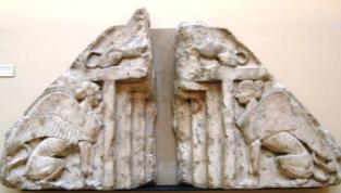 Треугольные вставки над верхней надвратной балкой встречаются в экспозиции Британского музея. К сожалению, и здесь верхняя часть барельефа утрачена. Но зато полностью сохранились сфинксы нижнего яруса. Остается вопрос: все ли ворота в городах микенской цивилизации были "львиные" или мы имеем дело с более поздним копированием микенского образца.