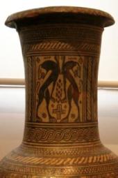 Возможную подсказку для разгадки изображения львов на микенских воротах мы находим в вазописи. На одном из образцов геометрического периода мы видим, что головы львов развернуты друг от друга. При таком изображении головы львов не упираются разделяющую их колонну. Но и в этом случае остается проблема: для такого изображения на треугольной вставке остается слишком мало места.