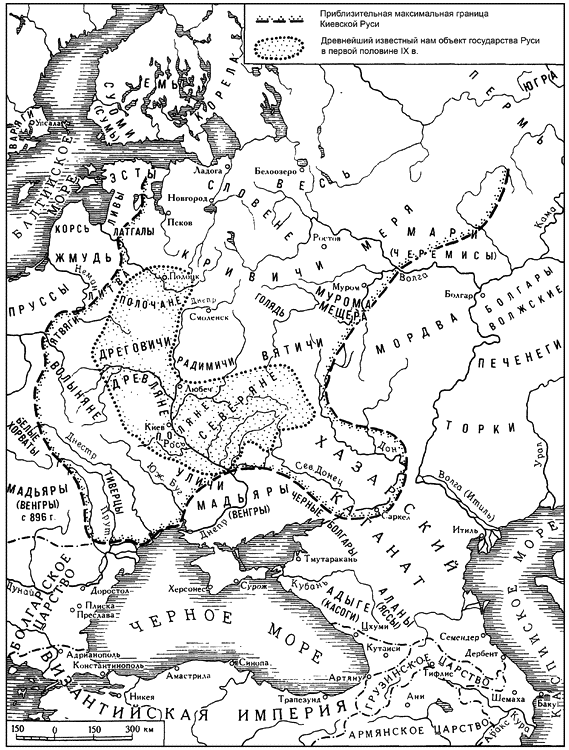 Первые полтора столетия исторической жизни Киевской Руси известны нам по скупым намекам источников, требующим пристального внимания и осторожности. Из суммы намеков и осмыслений выясняется все же процесс сложения государственности и государства. Государственность, классовые отношения, окняжение земли началось еще на уровне племенных союзов, т. е. примерно в полутора десятках отдельных центров. Примером может служить племенной союз Вятичей на Оке, где, по данным восточных географов, существовали князья («главы» племен) и верховный князь всего союза («глава глав»), соответствующий «светлому князю» договора 911 г. Ежегодный объезд подвластных племен и сбор повинностей — «приношений» — это уже оформленные узаконенные отношения господства и подчинения, осуществление реальной власти «светлого князя», окруженного конной дружиной в «превосходных кольчугах».