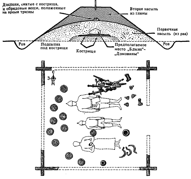 Курган Черная Могила середины X в. Разрез. Внизу — план погребального кострища (в укрупненном масштабе)