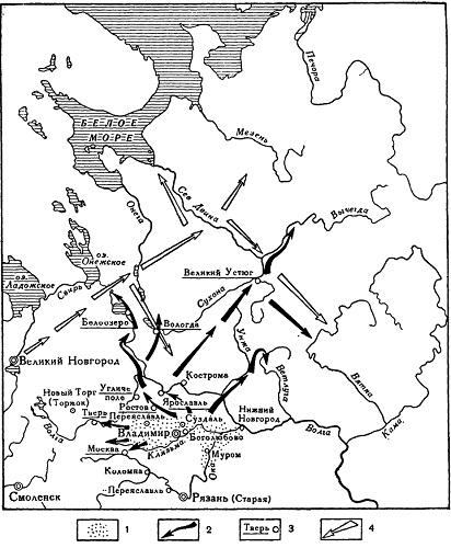 Основные направления перемещения населения Северо-Восточной Руси в последней четверти XIII в.: 1. Переяславское княжество, владимирские земли по Клязьме и нижней Оке, откуда наблюдалось массовое бегство населения в последней четверти XIII в. 2. Направление основных миграционных потоков. 3. Города, в которых с конца XIII в. наблюдается увеличение населения. 4. Направления новгородской колонизации.