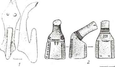 Рис. 132. Сидячі жіночі фігурки. Кінець пізнього Трипілля (1 — Красногірка; 2 — Усатове).