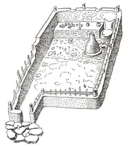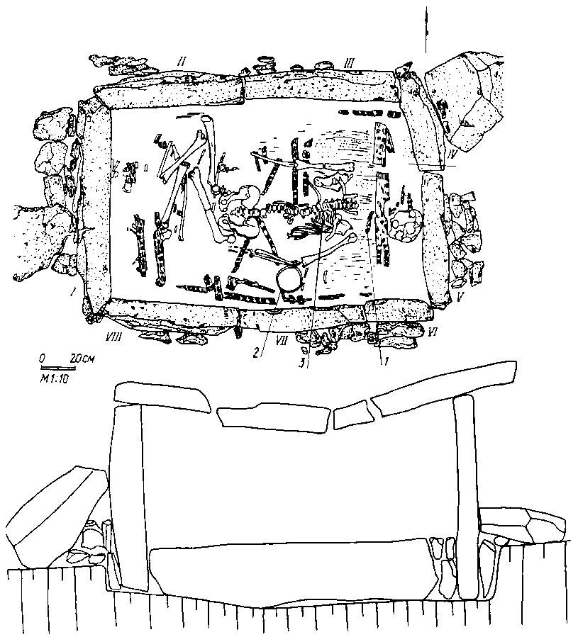 Рис. 143. Поховання кемі-обинської культури біля ст. Мойсеївка (курган 5, поселення 4) у кам'яній скрині з розписом: