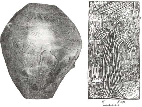 Рис. 140. Посудина з антропоморфними зображеннями та прорисовка антропоморфного зображення. Кінець середнього Трипілля (Гребені).