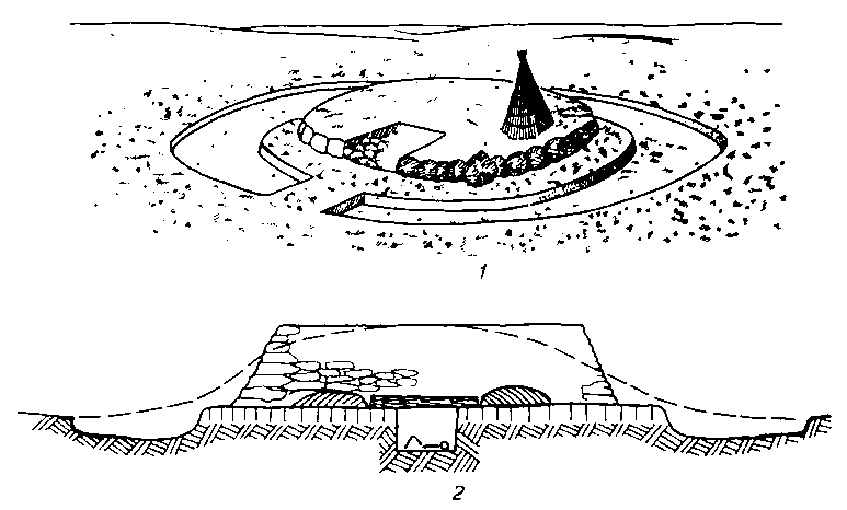 Рис. 142. Реконструкція первісного вигляду кургану доби ранньої бронзи (1) біля с. Новий Світ (курган 2) (за А. В. Андросовим) та модель розрізу кургану (2) ямного населення з обрисами руйнації під впливом природних факторів.