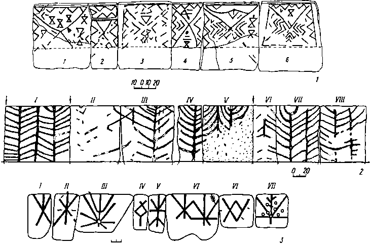 Рис. 144. Зразки розпису вохрою внутрішніх стін скринь кемі-обинських поховань: