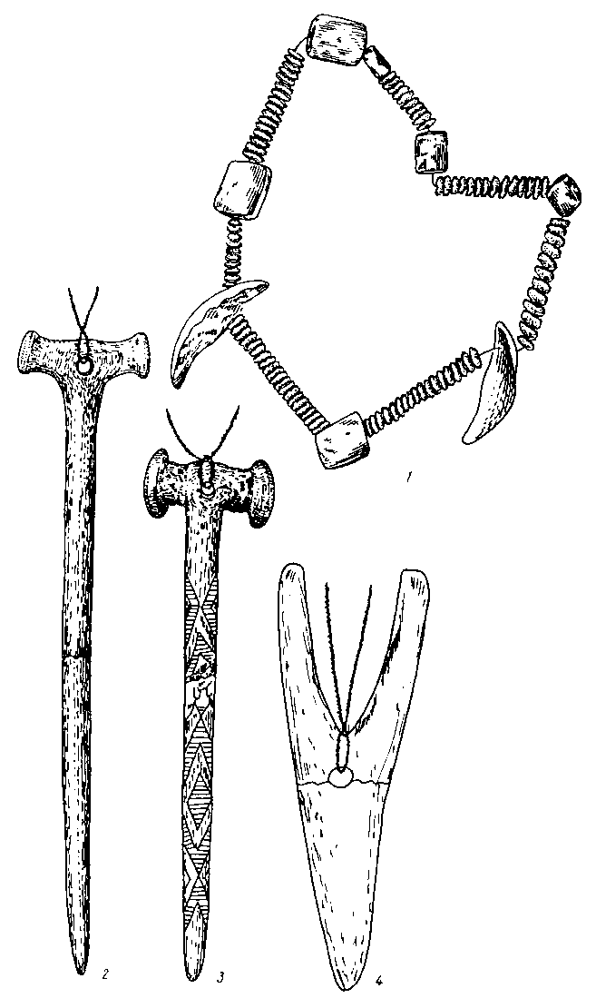 Рис. 147. Намисто з кістяних пронизок та підвісок-кликів, молоточковидні шпильки та роговий амулет — сакральні речі в ритуалі ямного населення:
