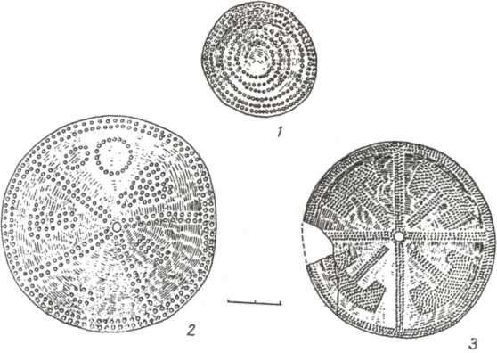 Рис. 148. Ритуальні бронзові бляхи з пуансонним орнаментом:
