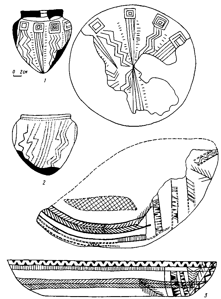 Рис. 149. Ямний посуд із складними семантичними орнаментальними зображеннями: