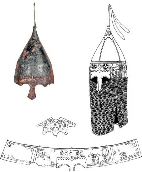Рис. 21. Шлем из Таганчи: фото (по: Gutowski, 1997); прорисовка узора (по: Gawrysiak-Leszczynska, Musianowicz, 2002); реконструкция шлема (рисунок А.Е. Негина).
