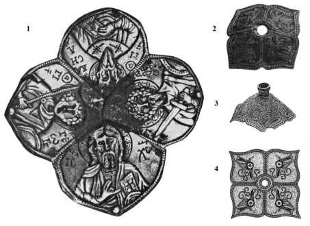 Рис. 24. Листовидные накладные пластины — детали наверший шлемов: 1 — Лыково (по: Янин, 1958); 2 — Энгельс (по: Максимов, 1962); 3 — Новый Сарай (по: Полубояринова, 1987); 4 — Новотерское (по: Нарожный, 2008).