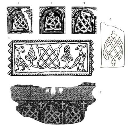Рис. 26. Изображения «узлов счастья» на русских домонгольских вещах XII — начала XIII века: 1–3 — Киев; 4 — Владимир; 5 — Шарки; 6 — Антоново (по: Древняя Русь, 1997).