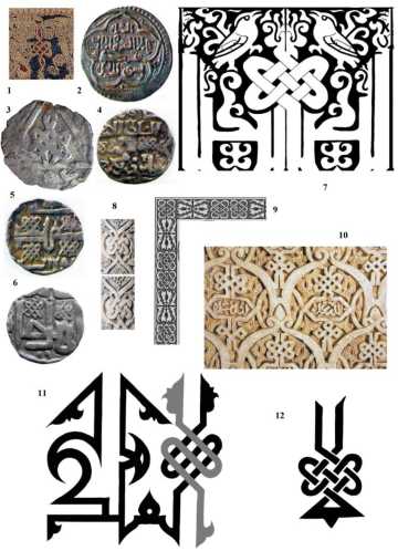 Рис. 27. Изображения «узлов счастья» на восточных вещах XII — начала XV в.: 1 — вышивка из Египта, период династии Айюбидов (1169–1260), музей Эшмола, Оксфорд; 2–6 — золотоордынские дирхемы XIII–XIV вв.: 2 — дирхем Газан-хана, начало XIV в.; 3 — дирхем неизвестного происхождения; 4–5 — дирхемы хана Узбека; 6 — дирхем Джанибека; 7 — узорная ткань из погребения 93 могильника Маячный бугор (Астраханская область), конец XIII в.; 8 — Исфаганская пятничная мечеть, михраб султана Олджейту (Иран) (1310 г.); 9 — орнаментальные мотивы в средневековой татарской архитектуре сельджукского стиля, кече манара в Булгаре (около современного города Болгар в Татарстане), Золотая Орда, Булгария, XIV в.; 10 — декор дворца эпохи Насридов в Альгамбре (Испания), начало XV в.; 11–12 — изображения букв арабского алфавита «алиф» и лигатуры «лям-алиф» (по: Mandel Khan, 2001. P. 28. Fig. 4; P. 94. Fig. 2).