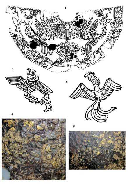 Рис. 28. Изображения птиц на шлемах: 1–2 — Венгерский национальный музей в Будапеште (по: Горелик, 2003); 3 — Сузунский бор (по: Ozheredov, Hudiakov, 2007); 4–5 — Городец (рисунки и фото А.Е. Негина).