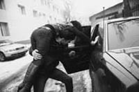 Парень похищает девушку и заталкивает ее в машину. Кривая изнасилований в годы ельцинской «демократии» резко пошла вверх. Объяснялось это просто: страну намеренно погрузили в разврат, а нищая милиция не могла справиться с валом преступности на этой почве. Красивую девушку могли остановить прямо на улице, затолкать в машину и увезти в неизвестном направлении.