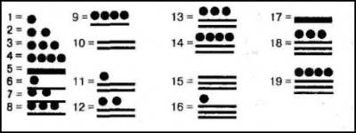 Майя записывали цифровые знаки в виде точек и тире, причем точка всегда означала единицы данного порядка, а тире — пятерки:
