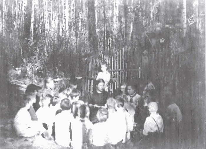 1. Группа пионеров слушает рассказ о Павлике Морозове.