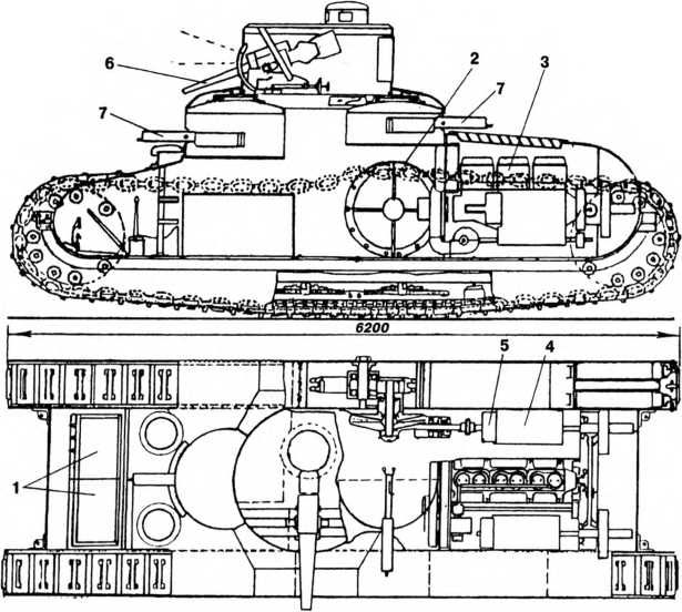 Эскизный проект танка Oberschleisen: 1 — посадочные люки, 2 — ведущее колесо, 3 — двигатель, 4 — коробка передач, 5 — тормоз, 6 — 57-мм пушка, 7 — 7,92-мм пулемет.