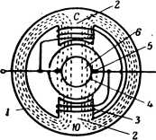 Корпус генератора 1 имеет один полюсный башмак 3, на котором намотана обмотка возбуждения 2. Роль второго полюсного башмака выполняет углубление на противоположной башмаку стенке корпуса.