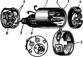 Рис. 78. Генератор Г-11: 1 — корпус генератора; 2 — обмотка возбуждения; 3 — полюсный башмак; 4 — передняя крышка корпуса; 5 — защитная лента; 6 — якорь; 7 — коллектор; 8 — задняя крышка корпуса; 9 — щетки.