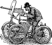 Публично она была продемонстрирована в Ричмонде еще в 1899 году. Это был так называемый квадроцикл — мотоцикл на четырех колесах. В центре хрупкого велосипедообразного сооружения сидел, пригнувшись к рулю как велогонщик, сам изобретатель. Позади него, у задней оси, тарахтел небольшой одноцилиндровый двигатель «Де Дион» мощностью всего 1,5 л. с., а впереди, перед рулем, располагался броневой щиток, прикрывавший голову и грудь водителя. В щитке имелась небольшая амбразура, в которой была установлена новинка тех лет — пулемет «максим» (в варианте с воздушным охлаждением ствола). Шла война с бурами в Южной Африке, и хваленая английская кавалерия часто несла огромные потери при разведке. Поэтому, по мысли изобретателя, именно это эфемерное сооружение должно было стать средством борьбы с бурскими снайперами.
