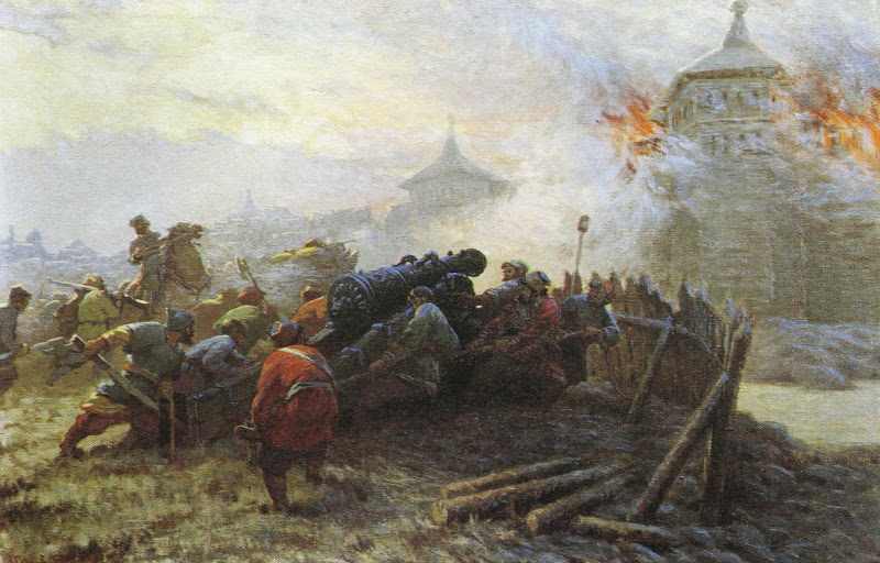 Между тем русские соорудили деревянную башню в шесть сажен вышиною, ночью тайком пододвинули ее к городской стене, к главным Царским воротам и поставили на башне 10 больших и до 50 малых пушек. Отряд самых искусных стрелков занял ее. С утра следующего дня стали с башни обстреливать город. Стрельцы стояли на башне выше городской стены и могли метко бить из пищалей людей на улицах и дворах; казанцы рыли себе ямы, землянки, прятались в них от русских выстрелов, но сдаваться и не думали, хотя царь им снова делал мирные предложения.