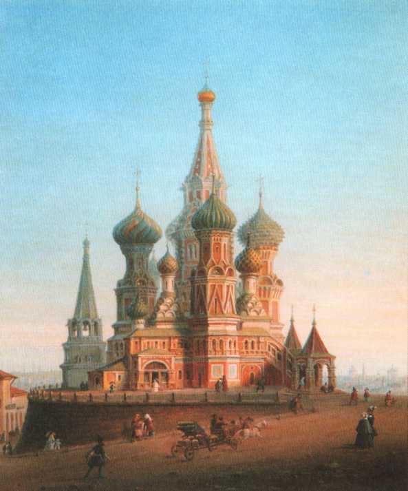 В память покорения Казани был тогда заложен в Москве, на Красной площади у Кремля, храм Покрова Богородицы. Теперь этот храм обыкновенно называют церковью Василия Блаженного, так как здесь покоятся святые мощи этого юродивого. Здание это представляет очень любопытный памятник своеобразного и затейливого зодчества. Строитель храма, несомненно, был человек весьма талантливый; имя его, к сожалению, неизвестно. В народе сложилось даже баснословное предание, будто царь, восхищенный красотой здания, велел выколоть глаза зодчему, чтобы он не мог нигде в чужом краю выстроить ничего подобного.