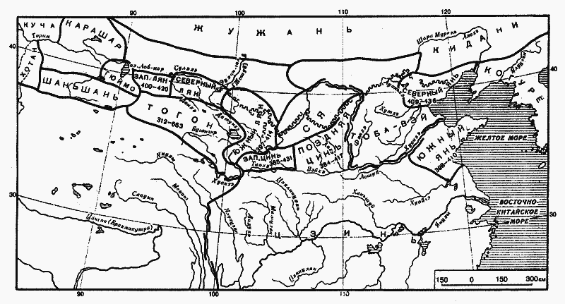 Подобные «забавы» сделали его слишком малопопулярным в народе, чем воспользовался один из его придворных, китайский авантюрист Фэн Ба, постоянный собутыльник царя. В 407 г. скончалась царица, и Муюн Си пошел за ее гробом на кладбище пешком, а было далеко, больше 20 ли. Пока шли похороны, Фэн Ба возмутил население столицы и возвел на престол приемыша Муюнов Гао Юня. Вернувшийся Муюн Си не был впущен домой и убит в схватке. Фэн Ба стал во главе армии. В 409 г. два гвардейца почему-то убили Гао Юня. Фэн Ба казнил их, сел на престол сам и объявил, что его царство называется Северная Янь. В 412 г. он заключил союз с Жужаньским каганатом[835] и империей Цзинь, обещавшей ему помощь против табгачский империи Северная Вэй. Впрочем, табгачи были заняты на западе и севере войной с хуннами и жужанями. Это дало новому китайскому царству 20 лет покоя.