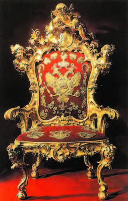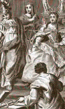 Анна Иоанновна на троне со скипетром в руке. Фрагмент гравюры