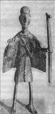 К началу развития нурагического периода появляется еще один тип построек — массивные сооружения с монументальным входом, отличающиеся от обычных жилищ не только значительным размером, но формой. Их принято называть храмами. Таких сооружений насчитывается пять, и все они находятся в южной и центральной части острова. С IX в. до н.э. в священных пещерах и храмах, а иногда и в могилах, находят небольшие бронзовые фигурки, или «бронзетти», как их называют итальянцы. Они впервые дают представление об обитателях нурагической Сардинии, характеризуют общественную среду, одежду, вооружение, занятия, представления о богах, художественный вкус и интересы обитателей нурагов. Эти фигурки, числом более пятисот — результат индивидуальной творческой работы. Ни одна из них не повторяет другую. Люди изображены в самых различных позах — стоящими, сидящими, идущими, борющимися, в одиночку и парами. По особым кинжальчикам и другим знакам власти могут быть выделены лица высокого общественного положения. Видим мы также пастухов, музыкантов, участников жертвоприношений, атлетов. Встречаются и фантастические существа с четырьмя руками, держащими два меча и два щита. На голове у одного из них шлем с двумя рогами, символом бога быка. Это явно божество войны.