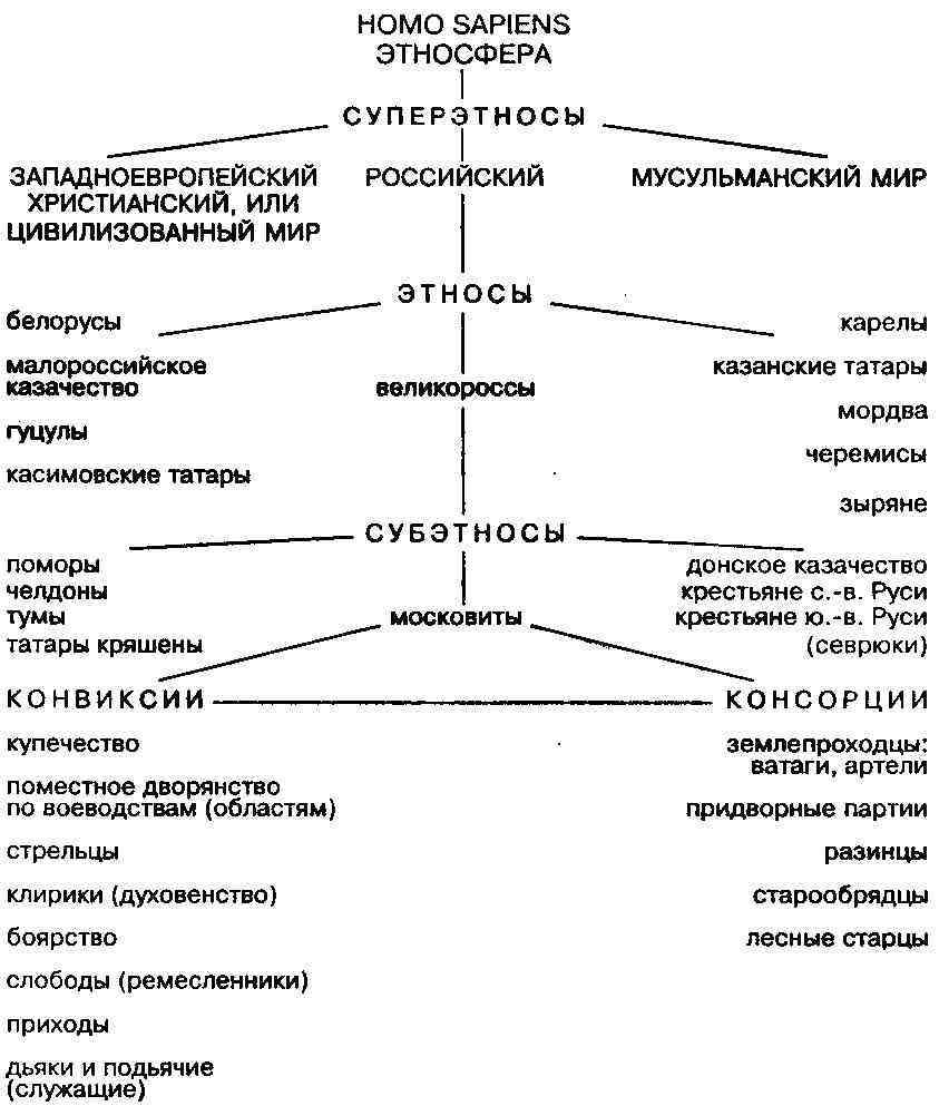 Но каков механизм возникновения субэтносов? Чтобы ответить, необходимо спуститься на порядок ниже, где находятся таксономические единицы, расклассифицированные нами на два разряда: консорции и конвиксии. В эти разряды удобно помещаются мелкие племена, кланы, корпорации, локальные группы и прочие объединения людей всех эпох.