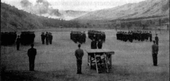 Рис. 44. Школьная линейка в школе под Сеулом, 1950-е гг. В южнокорейских школах продолжала практиковаться военная дисциплина, мало отличавшаяся от порядков начала 1940-х гг., когда японские колонизаторы мобилизовывали корейцев на войну против США и Китая и использовали школьное образование прежде всего как средство допризывной подготовки будущих солдат.