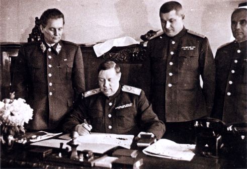 Подписание соглашения между советским командованием и командованием Югославской Народно-освободительной армии, (на снимке И. Б. Тито, Ф. И. Толбухин). Югославия, сентябрь 1944 г.